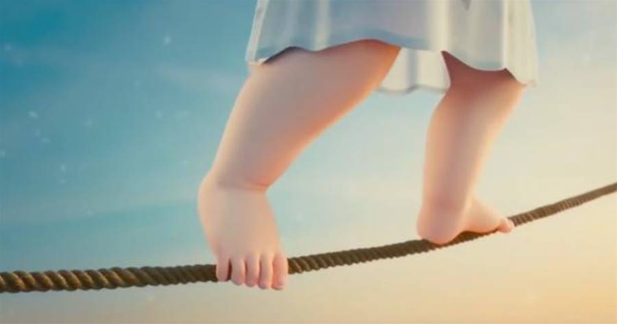 女嬰必須適應繩索上的生活,才能行走。小麻雀好奇地湊上去和女嬰玩耍。