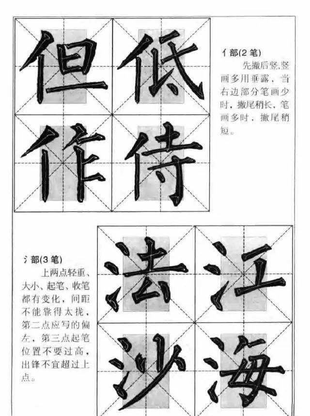 亻部2筆 先撇后豎,豎畫多用垂露,當右邊部分筆畫少時,尾稍長,筆畫多時,撇尾稍短。